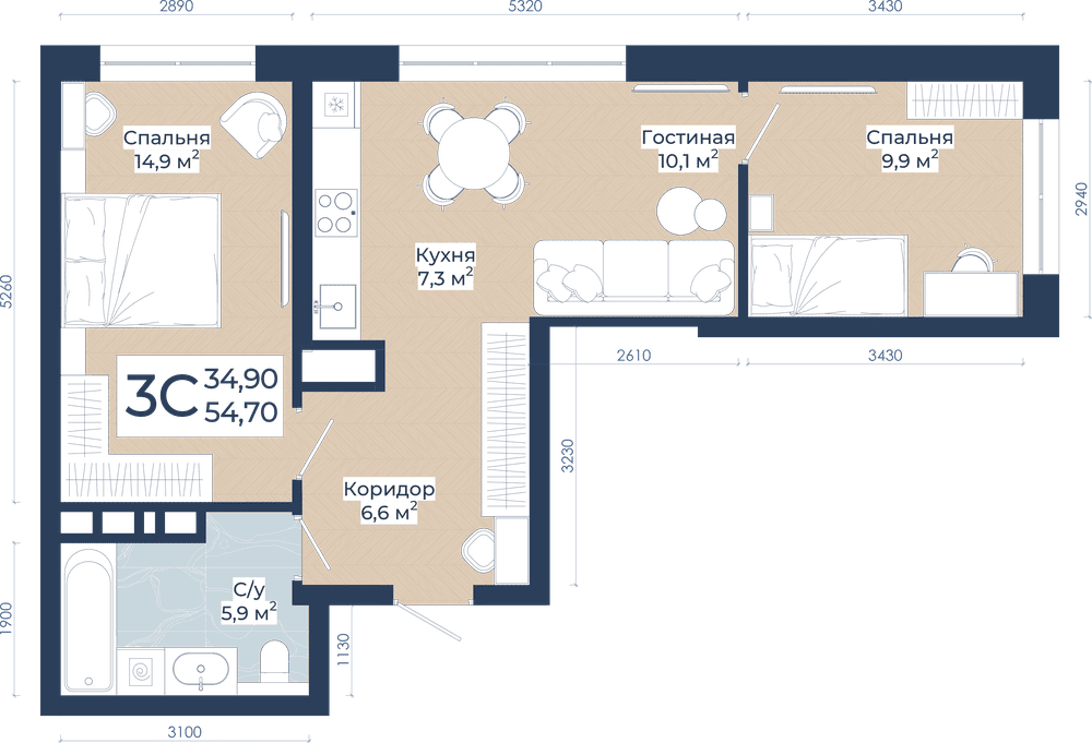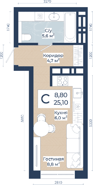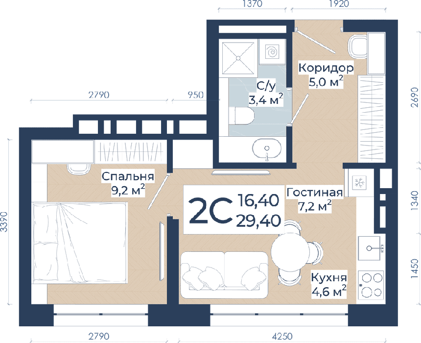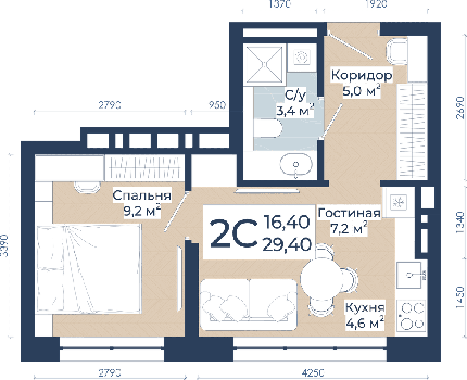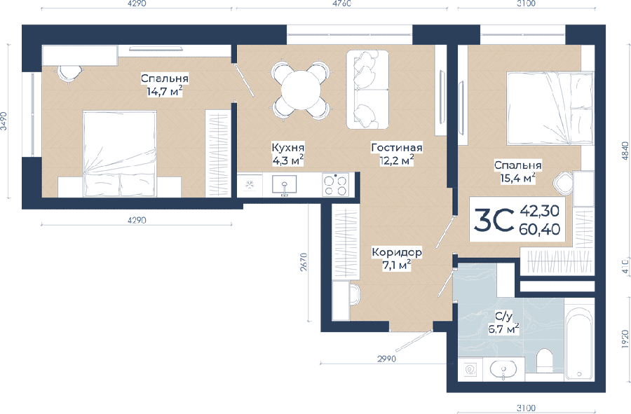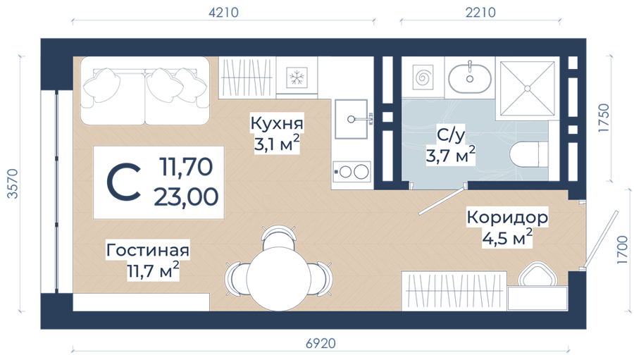 Высокие потолки от 2,7 метра во всех квартирах — это на 20% выше стандартных 2,5 метра в типовых новостройках. Окна с расширенным профилем увеличивают естественное освещение на 10-15%. Такая комбинация визуально расширяет даже компактные студии, снижает зависимость от искусственного света и экономит на счетах за электричество.