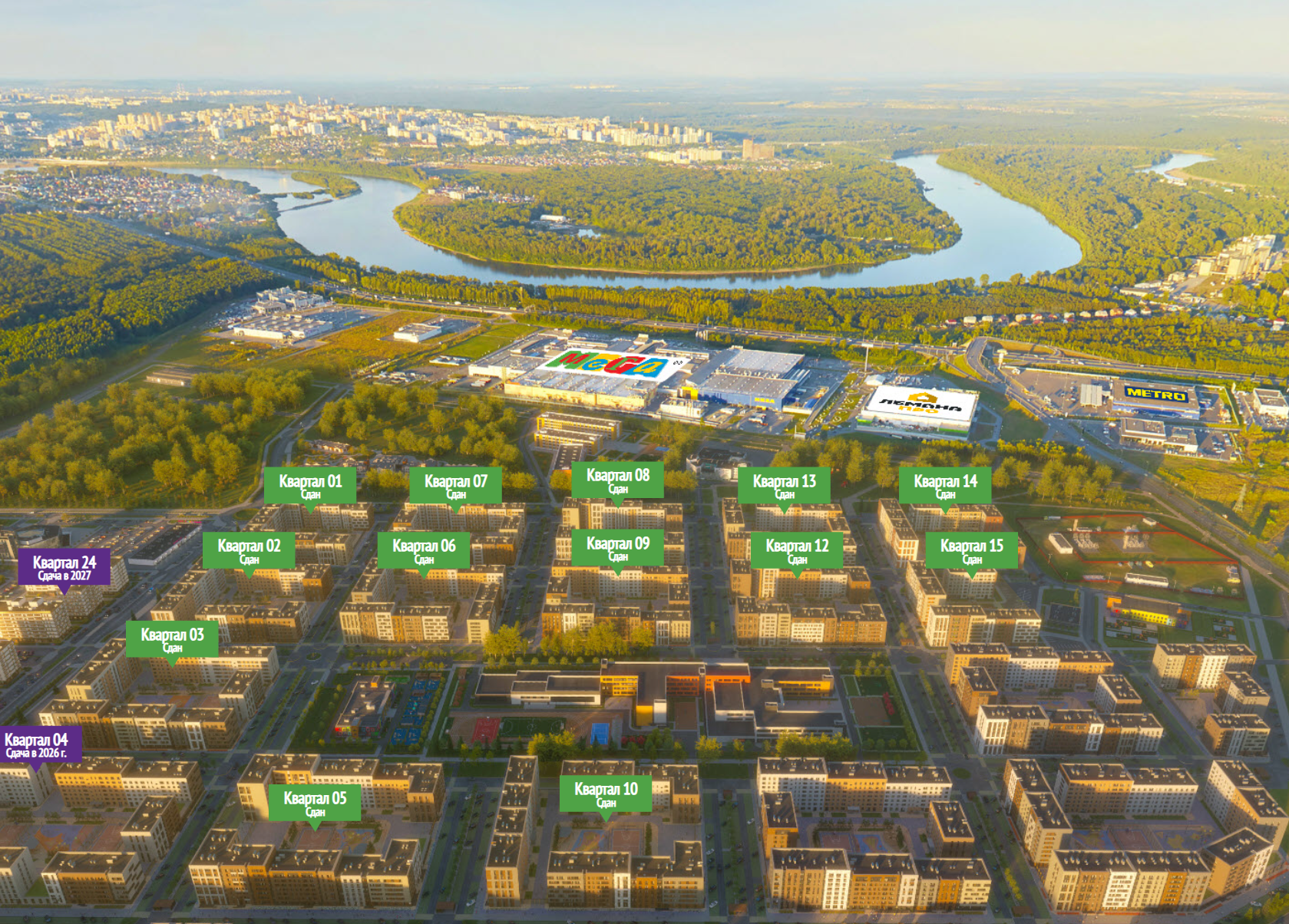 Вместо вечной дилеммы «ближе к природе или ближе к городу» здесь удается совместить оба сценария: лесные виды, река и прогулки по квартальным аллеям, при этом торговые центры, сервисы и транспорт уже в нескольких минутах пешком. А до до делового центра Уфы всего 10-15 минут на транспорте.