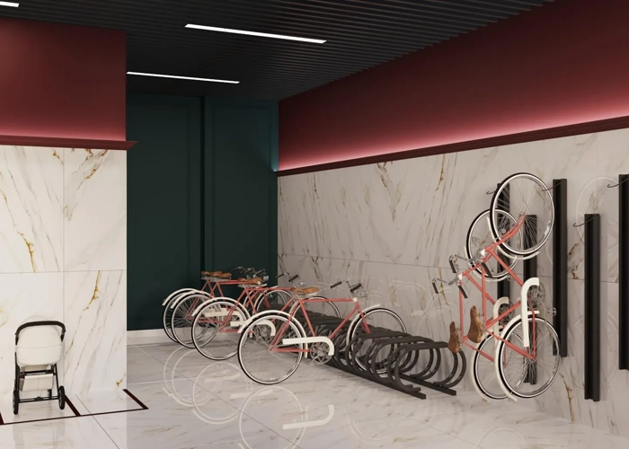 В холле вас встречает дружелюбный ресепшен с мраморной стойкой, мягким светом и изящной лепниной. Для жителей предусмотрены коворкинг, библиотека и зона отдыха с камином, а для детей — игровая комната с горками, стеной для подъёмов, сухим бассейном и творческими панелями.